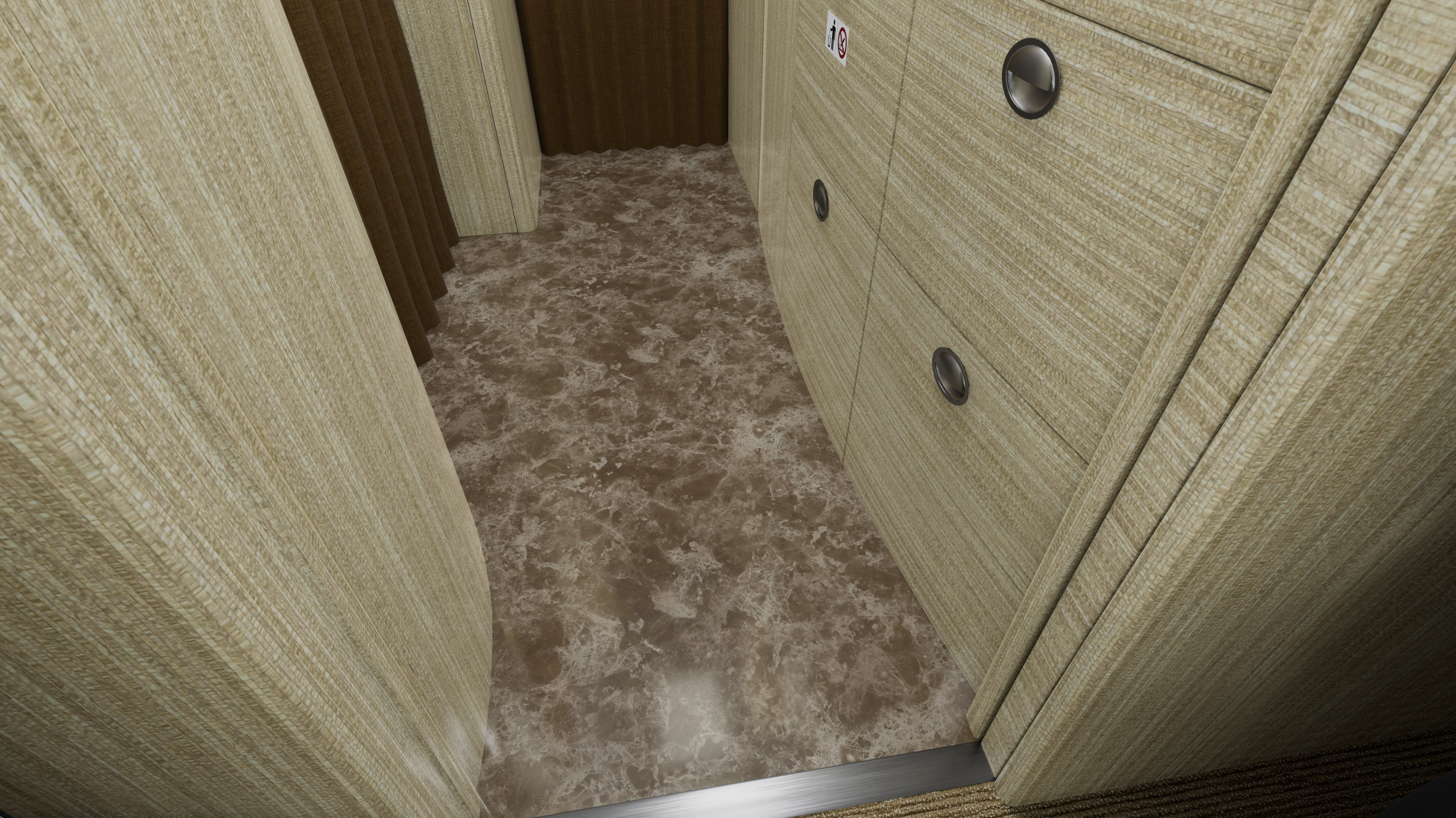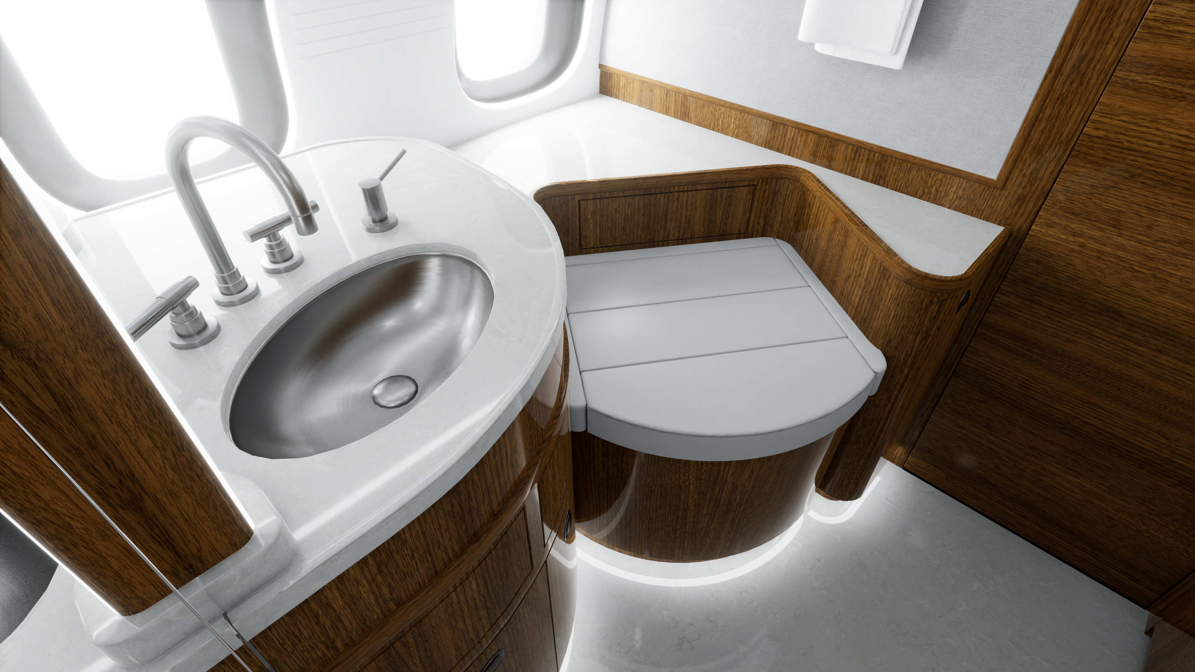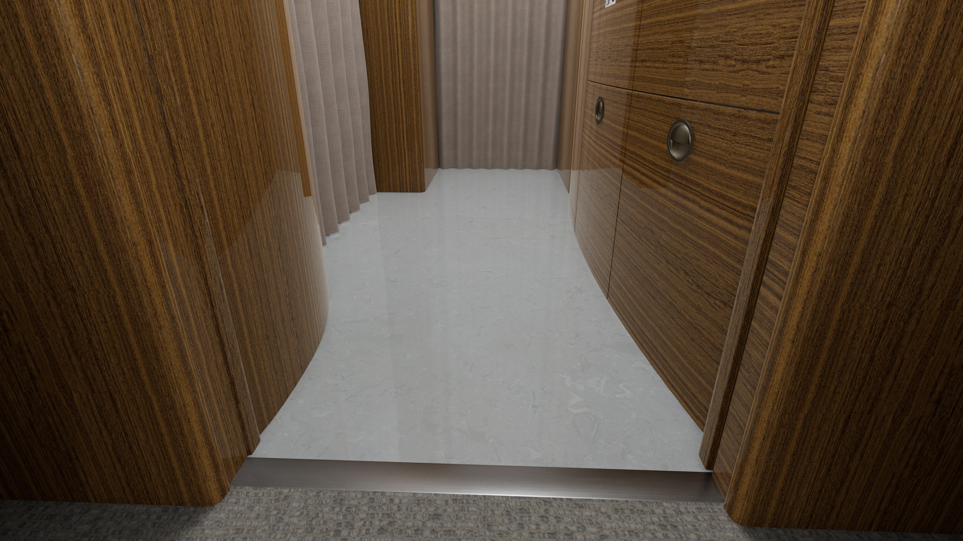 Stone entry, galley, and lavatory stone flooring is a sign of a modern business aircraft.